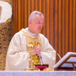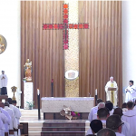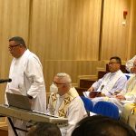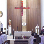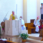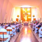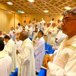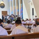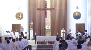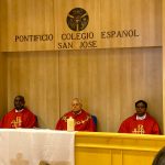 El lunes, 27, comenzaba la Asamblea puntualmente a las nueve de la mañana con la Eucaristía de apertura en la iglesia del Colegio Español. La presidía el Superior General. P. Tomás Mavric, que estaba acompañado en el presbiterio por los miembros de su Consejo y por dos Obispos de la Congregación: Mons. Rolando Santos, obispo en Papúa-Nueva Guinea, y Mons. Andrew Bellisario, arzobispo de Anchorage-Juneau, en Alaska (USA). Todos los participantes ocupamos la amplia Iglesia y concelebramos con alegría y esperanza. La parte musical corrió a cargo del Grupo Gen Verde, que nos sorprendió por la belleza y contenido de los cantos, utilizando diversas lenguas. El idioma empleado en esta primera Eucaristía fue el español.