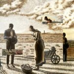 La cuarta pared es la pared de la entrada principal, o más bien, la pared de la salida de la casa. ¿Qué vemos? En lo alto de la pared, sobre la puerta principal, vemos la imagen del Espíritu Santo y la palabra «evangelizar». A ambos lados de la puerta principal vemos un campo de trigo donde el trigo se mezcla con los mismos rostros humanos que componen el retrato de san Vicente en la primera pared que vemos al entrar en la casa.