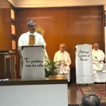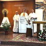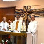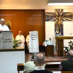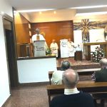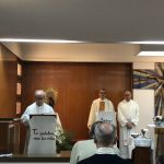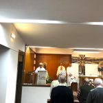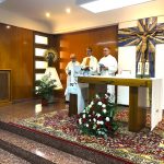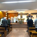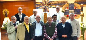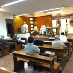 Terminada esta sesión, nos trasladamos todos a la capilla de la parroquia para celebrar la Eucaristía. Presidió la Misa el P. David Carmona, que hace los 25 años de sacerdote, y era acompañado en el presbiterio por el P. Antonio Velloso (sesenta años de vocación y el P. Visitador. El P. Jaime Corera celebraba también los setenta años de vocación, pero prefirió participar desde los bancos debido a sus problemas con la vista. El P. David se refirió, sobre todo, a la importancia de este día para la Provincia y a la necesidad de crecer en espíritu vicenciano para mejor identificarnos con nuestra vocación y reforzar nuestro sentido de pertenencia a la Congregación. Dio gracias, además, por sus bodas de plata sacerdotales y nos invitó a interceder por los misioneros de la Provincia que conmemoran durante este año diversos hitos en su camino vocacional. Todos participamos con gozo y entusiasmo en la Eucaristía, acabando con una foto de familia delante del altar.