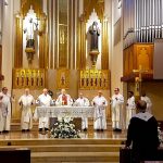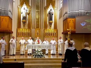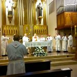 Tras los saludos de rigor nos preparamos para celebrar la Eucaristía. En la iglesia estaban los Padres mayores y enfermos dando gracias a Dios por el carisma vicenciano. Presidió la Eucaristía el P. José Luis Induráin, Superior de la Comunidad de la Residencia y uno de los homenajeados por cumplir este año –el 25 de septiembre- 60 años de vocación; los mismos que los Padres José Manzanedo y Tomás Peribáñez. También serán homenajeados: el P. Emilio Molina cumplirá 70 años de vocación (el 18 de septiembre) y el P. Luis Moleres, el 7 de septiembre, 60 años de la ordenación sacerdotal.