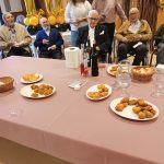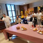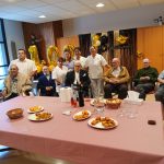 Después de la Misa pasamos al salón y ahí le cantamos las felicidades. El marido de una trabajadora, que ha sustituido en verano a los trabajadores en vacaciones, toca la trompeta en una orquesta y nos alegró, tocando varias piezas muy conocidas, incluidas las felicidades. Hubo también croquetas, chistorras, pan y vinos.