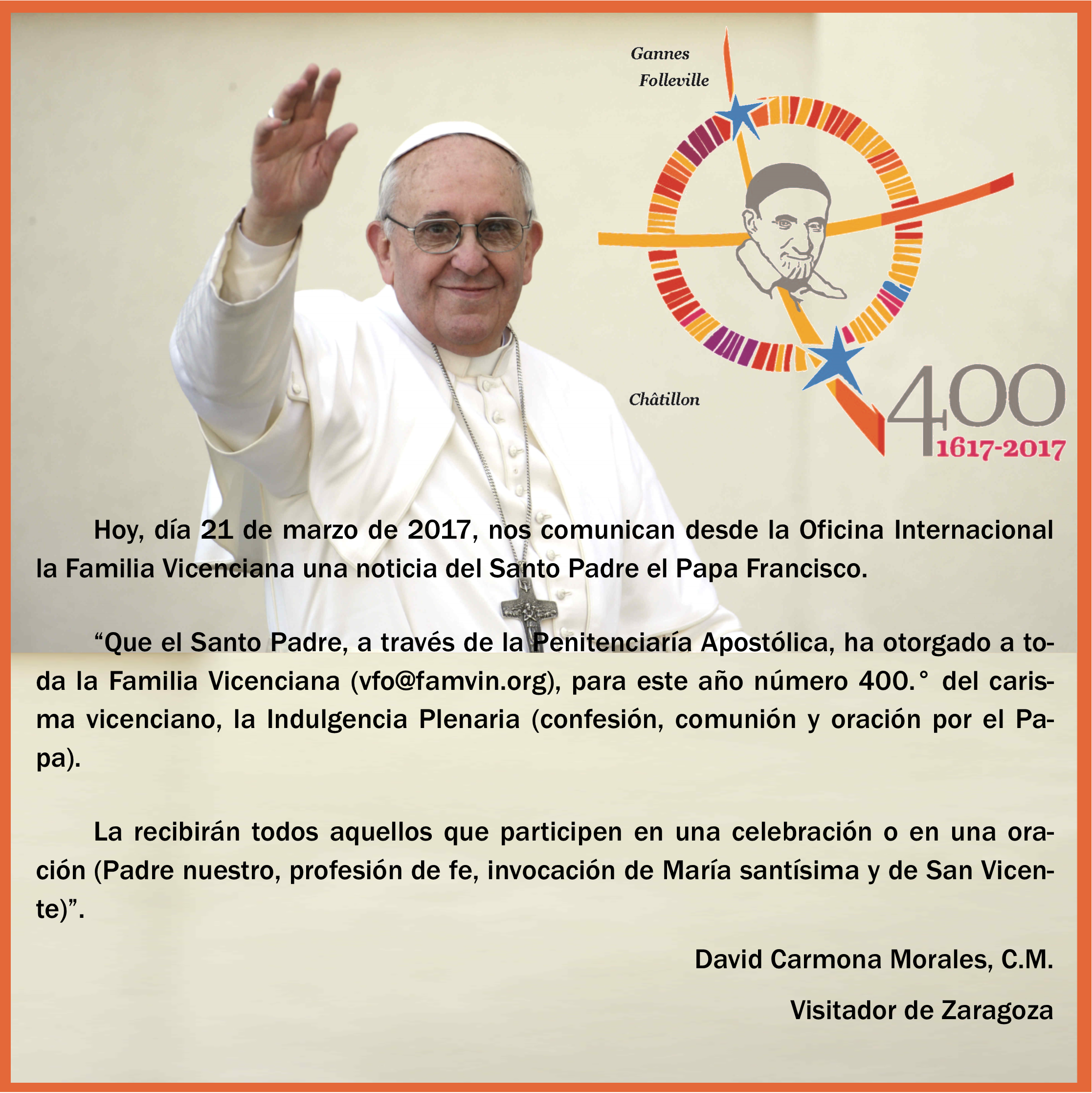 “Que el Santo Padre, a través de la Penitenciaría Apostólica, ha otorgado a toda la Familia Vicenciana (vfo@famvin.org), para este año número 400.° del carisma vicenciano, la Indulgencia Plenaria (confesión, comunión y oración por el Papa). La recibirán todos aquellos que participen en una celebración o en una oración (Padre nuestro, profesión de fe, invocación de María santísima y de San Vicente)”.