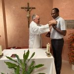 La celebración ha sido muy sencilla y ha tenido lugar en la oración comunitaria de Laudes. Tras cantar el himno a San Vicente y los salmos correspondientes, el P. Santi ha recibido a Athanase y Gyldas en el Seminario haciéndoles entrega del libro de las Constituciones y de una cruz vicenciana.