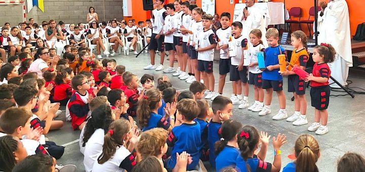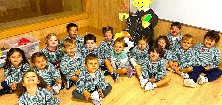 ¡Viva San Vicente! Desde las ocho de la mañana entran los alumnos mayores por la puerta verde del cole, en media hora entrarán los pequeños. En las mochilas la ofrenda en forma de comida...