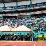 Después de hacer nuestra correspondiente parada pudimos refrescarnos y tomar algunos alimentos para seguir el camino. Llegamos a las 9 de la mañana al estadio y nos encaminábamos hacia el lugar donde estábamos ubicados como zona Medalla Milagrosa. Allí participamos en la animación, exposición del Santísimo, Santo Rosario, actuaciones folclóricas típicas de Honduras. También el intenso calor de la tarde creo algunos percances entre los jóvenes y mayores que tuvieron que ser atendidos por la Cruz roja y Copeco.