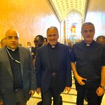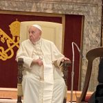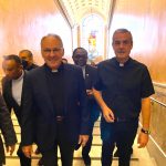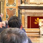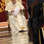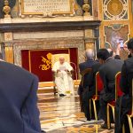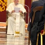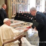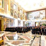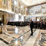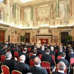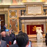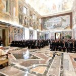 Dentro de la sala éramos 3 congregaciones que terminábamos conjuntamente las respectivas Asambleas Generales (o Capítulo General, en la terminología de los religiosos). Dichas Congregaciones eran la Orden de la Madre de Dios, la Orden Basiliana de San Josafat. Puntualmente a las 11 de la mañana, como estaba previsto, comenzó la audiencia con la llegada del Papa a la sala. Nuestro Superior General, el P. Tomaž Mavrič, dirigió unas palabras al Santo Padre donde le agradecía la oportunidad que nos daba para este encuentro. Seguidamente, el Padre Tomaž compartió la experiencia de San Vicente como «místico de la caridad», como aquel que construyó puentes entre los misterios de nuestra fe y el mundo, especialmente los pobres.