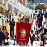 Uno de los dos coros parroquiales amenizó con sus cantos toda la Celebración y posterior procesión por las calles adyacentes: Calle Tomás Zerolo, Avda. Comunidad Iberoamericana, Calle Reverendo Tomás Rodríguez y Urbanización Carmentany. Delante del cortejo, abrían la marcha los niños que habían hecho su Primera Comunión el fin de semana anterior en la Parroquia, con sus trajes. A continuación, las banderas, pendones y blasones de las Cofradías parroquiales. Les seguían los ciriales portados por los monaguillos más mayores, ataviados con dalmáticas y la cruz procesional con manga, seguidos de los monaguillos más niños portando los incensarios y las navetas. A ambos lados, las hermanas de las diferentes cofradías parroquiales custodiaban el trono con la Custodia, que era llevado por los hermanos masculinos de dichas cofradías a pulso. Detrás, el Párroco don Gregorio bajo palio, que era portado por cuatro damas de las cofradías. Tras él, los PP. Vega y Estapé, portaban el libro de oraciones y auxiliaban al Párroco. Tras ellos, los Hermanos de la Divina Providencia, quienes eran seguidos por los miembros del Excelentísimo Ayuntamiento. Cerraban la marcha la gran banda municipal con sus tambores y trompetas.
