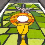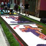 El sábado, día 2 de junio, amaneció soleado, aunque con un poco de viento. Ya desde las siete de la mañana, fueron llegando los integrantes de los grupos parroquiales y vecinales a iniciar el trabajo con los materiales que, durante toda la semana, había traído el Ayuntamiento, y que cada grupo coloreó según el tapiz que fueran a realizar.