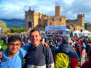 Junto a los jóvenes de la Diócesis de Zaragoza, partimos muy temprano hacia la localidad de Lumbier, donde comenzó nuestra peregrinación. Contra lo que se pronosticaba, el tiempo fue favorable, aunque con algo de lluvia. Tras atravesar la impresionante foz, llegamos a Liédena, donde recibimos una catequesis grupal, celebramos la Eucaristía y compartimos la comida. Por la tarde, continuamos la caminata -sin pausa pero sin prisa- hasta el Centro Diocesano de Javier, donde pasamos la noche. Tras la cena, participamos en una vigilia, que nos ayudó a prepararnos espiritualmente para nuestra llegada, al día siguiente, al castillo del Patrono Universal de las Misiones.