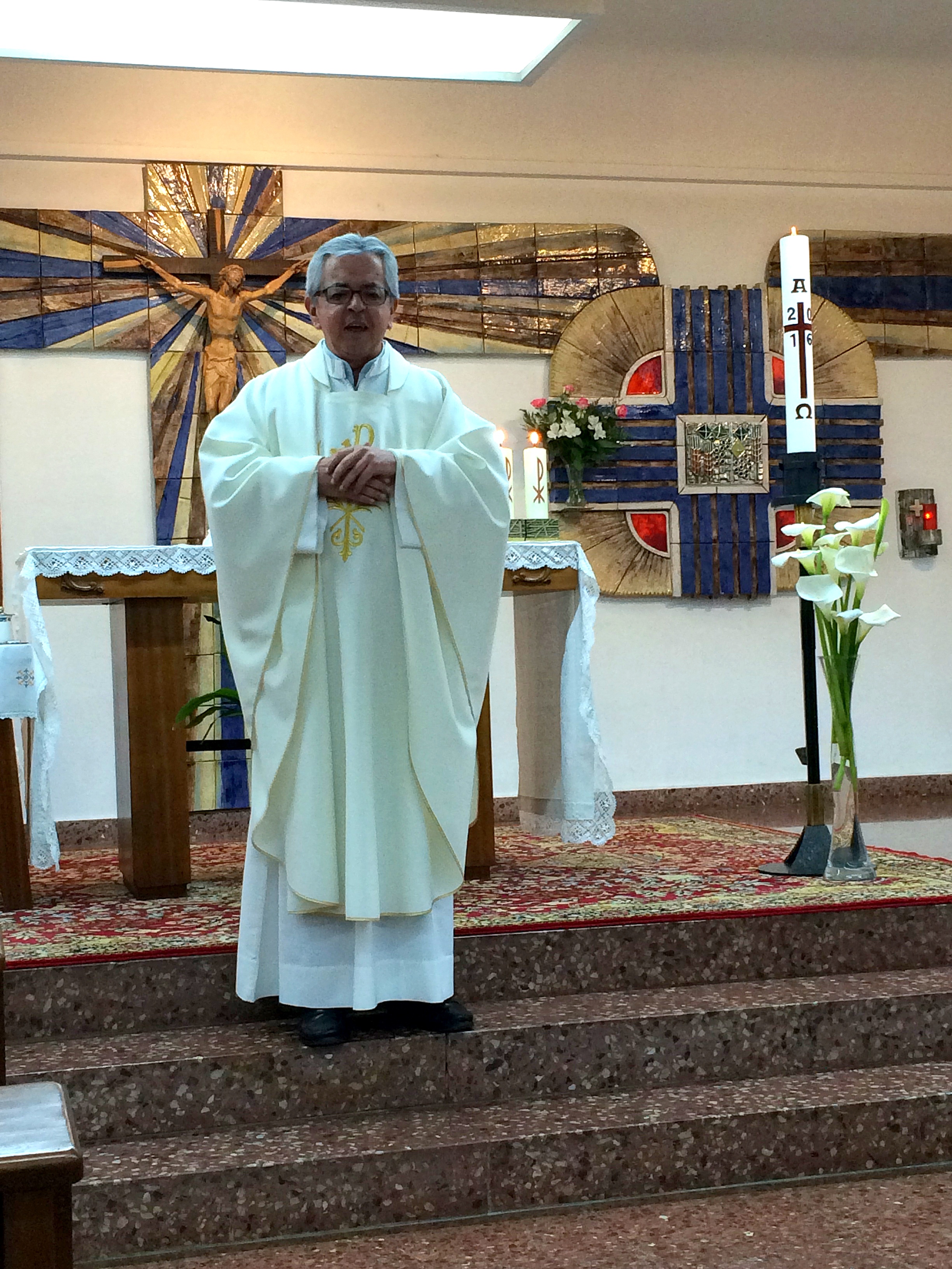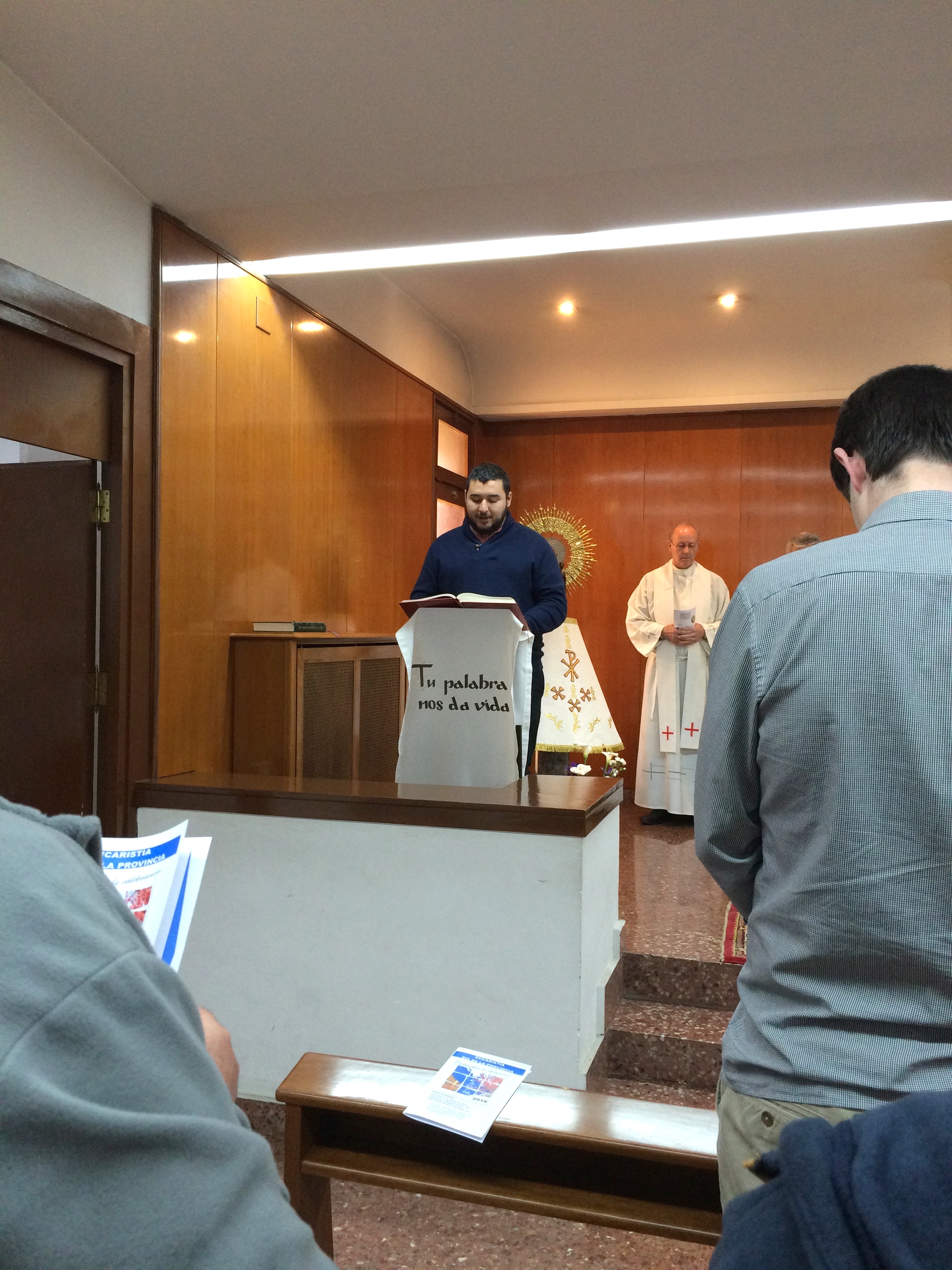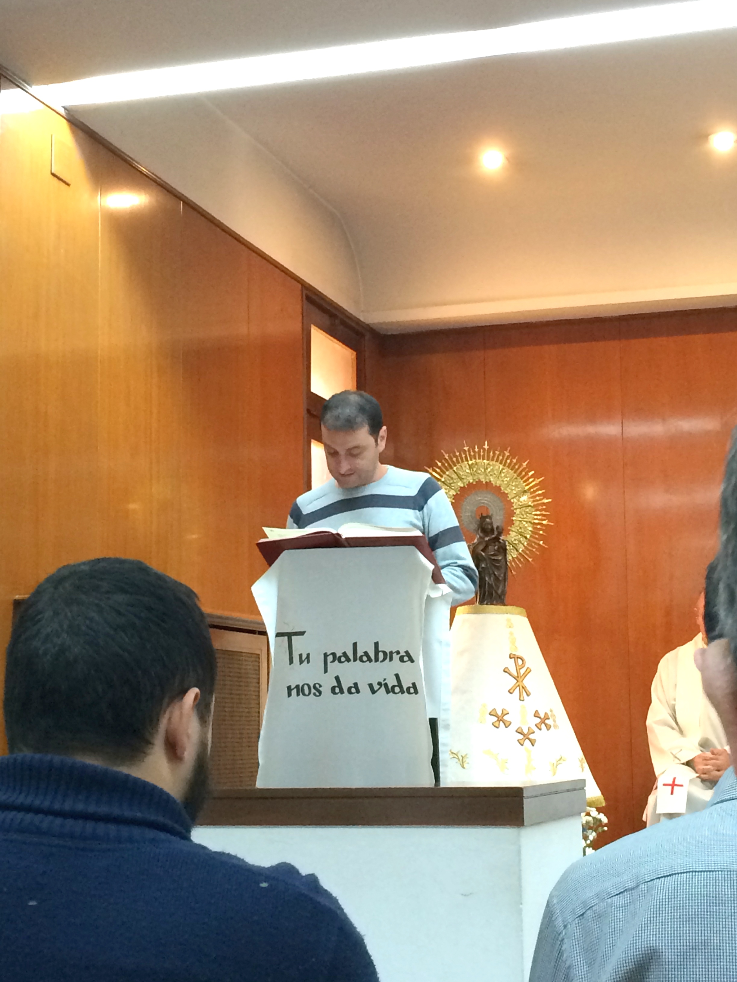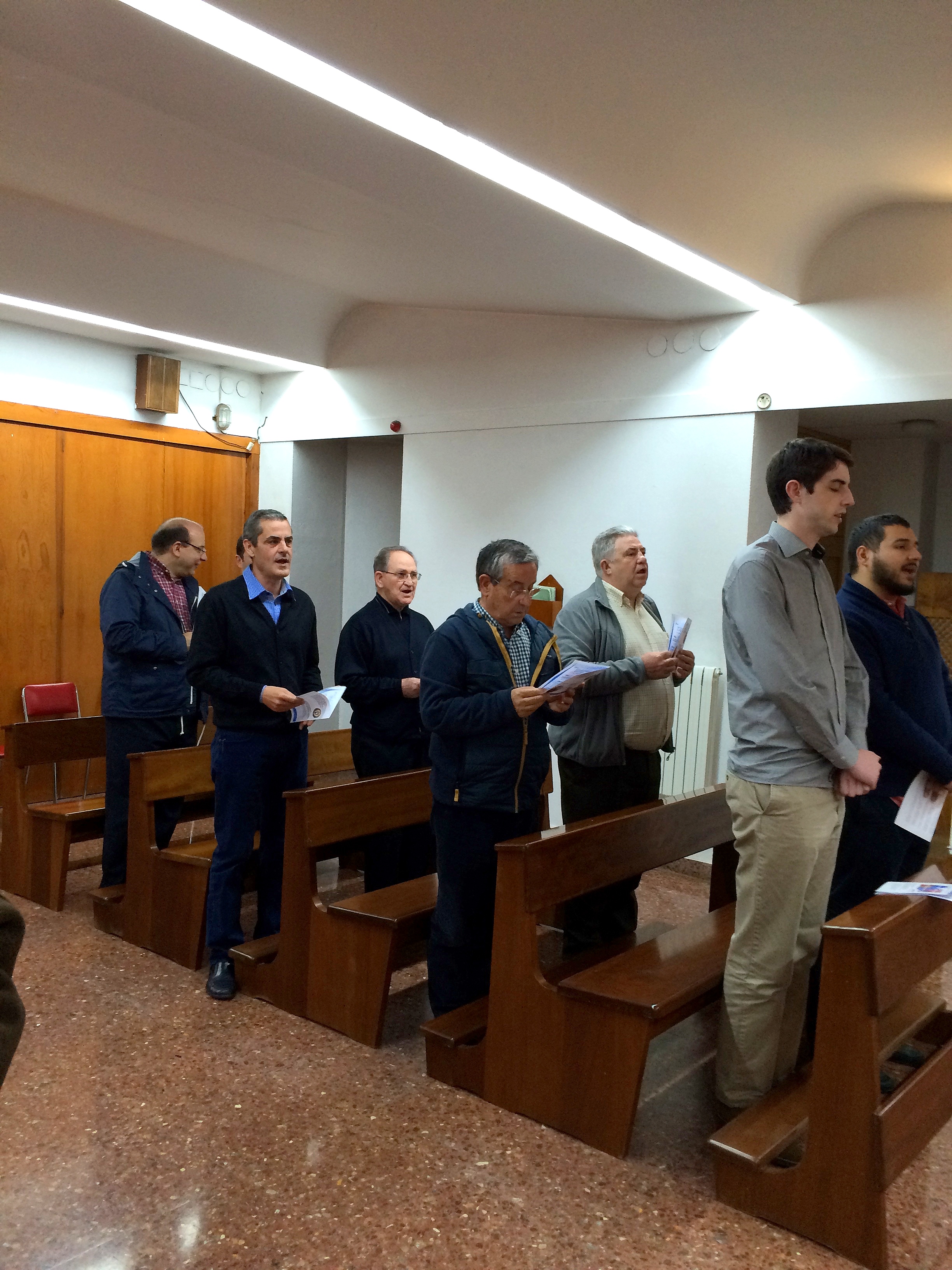 Era la una de la tarde cuando confluíamos en la capilla de la parroquia los dos grupos que habíamos trabajado en paralelo. Nos juntamos para celebrar la Eucaristía y dar gracias a Dios por la presencia del P. Eli entre nosotros, así como por los sesenta años de vocación de los PP. José María Alfonso Loyola y Ángel Pascual Pérez. Estos tres misioneros presidían desde el altar, uniéndonos los demás desde la pequeña nave. Moniciones, cantos, lecturas, peticiones y comunión se sucedieron en la celebración. Y nos quedó el mensaje del P. Eli: que sigamos trabajando y profundizando en lo que de bueno él ha observado en su visita a la Provincia: el buen nivel de oración y vivencia de fe en la comunidad, la alegría y el buen humor que se dispensan los misioneros y la inquietud misionera que se vive en las comunidades y Provincia.